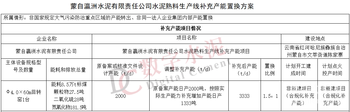 摘要:蒙自瀛洲水泥有限责任公司水泥熟料生产线补充产能项目原备案产能日产2000吨,按照实际生产能力补充增加产能日产1333吨,补充后产能日产3333吨,置换比例为1.5:1。