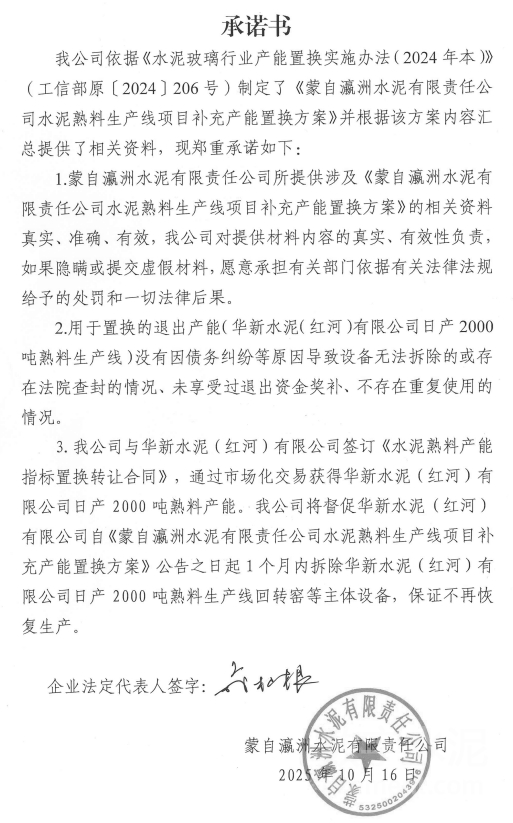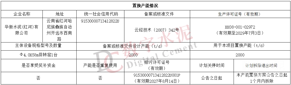 根据公示,蒙自瀛洲水泥有限责任公司水泥熟料生产线补充产能项目原备案产能日产2000吨,按照实际生产能力补充增加产能日产1333吨,补充后产能日产3333吨,置换比例为1.5:1。华新水泥(红河)有限公司一条日产2000吨熟料线用于本项目置换产能,计划在本产能置换方案公告之日起1个月内拆除。