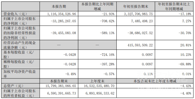 摘要:公司前三季度实现营业收入33.28亿元,同比减少17.18%;归属于上市公司股东的净利润748.55万元,同比增加7.27%。
