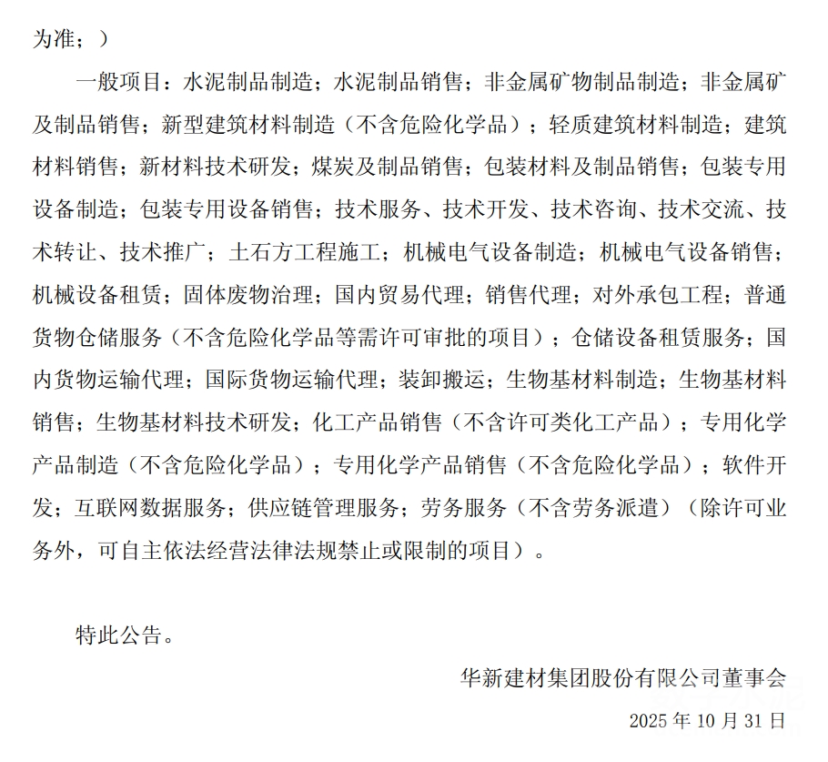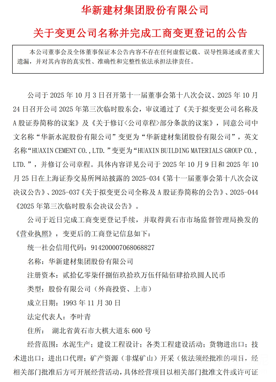 10月31日,华新建材集团发布《关于变更公司名称并完成工商变更登记的公告》显示,公司于2025年10月 3日召开第十一届董事会第十八次会议、2025 年10月24 日召开公司 2025 年第三次临时股东会,审议通过了《关于拟变更公司名称及a 股证券简称的议案》及《关于修订<公司章程>部分条款的议案》,同意公司中文名称“华新水泥股份有限公司”变更为“华新建材集团股份有限公司”,英文名称“huaxin cement co.,ltd.”变更为“huaxin building materials group co.,ltd.”,并修订公司章程。